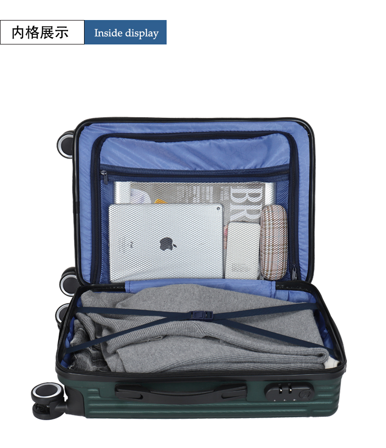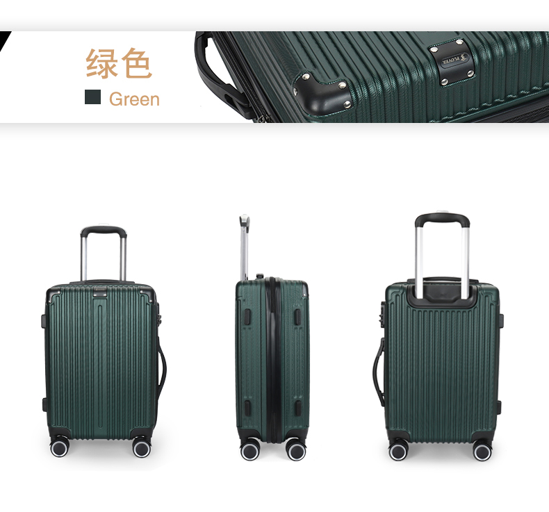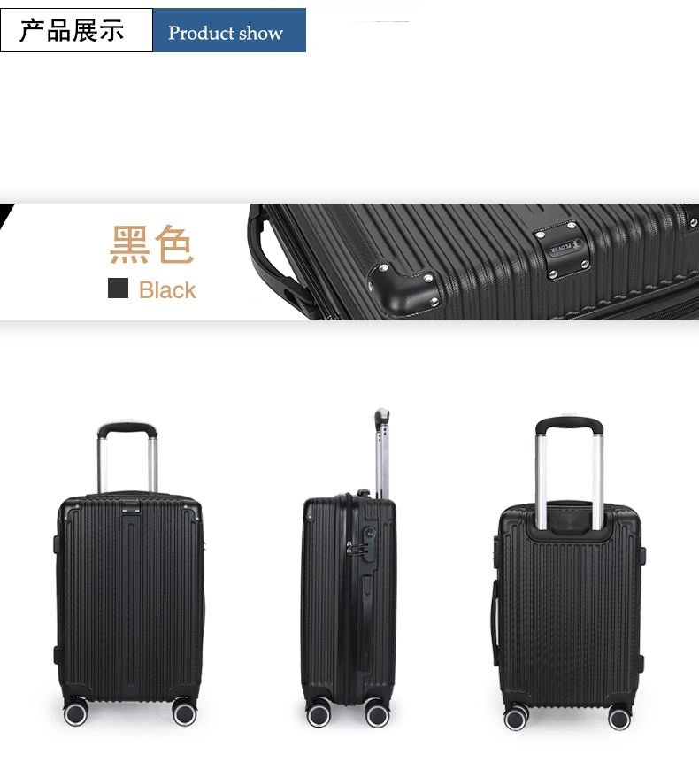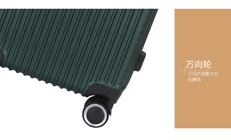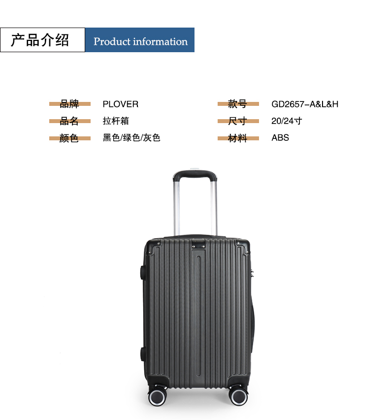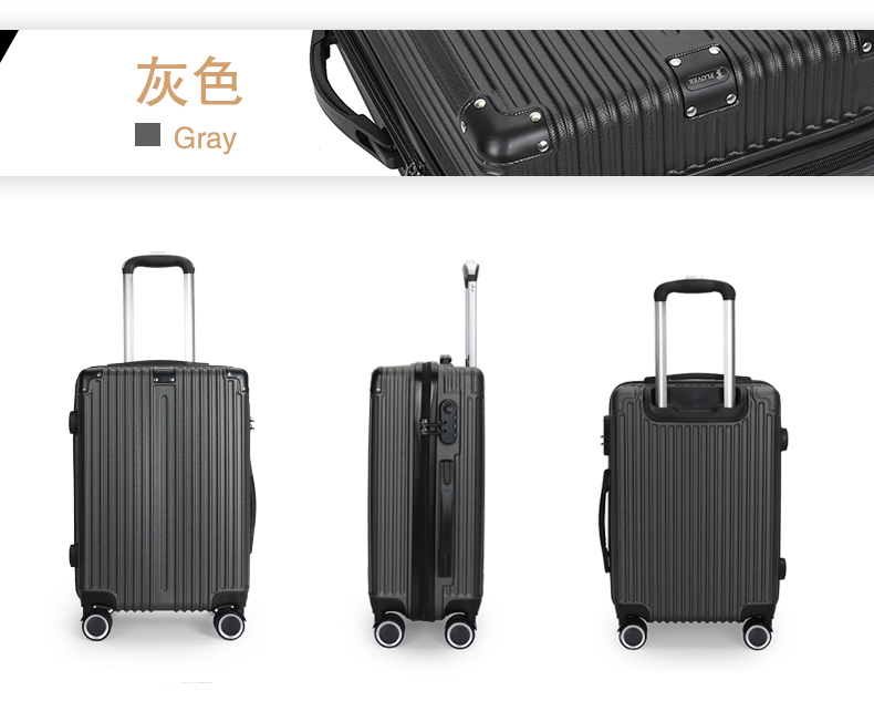 主材料采用ABS加厚,前置包角防撞防划,竖条纹设计增加箱体的承重能力,自动回弹软提手提高使用舒适性,双轱辘四轮万向轮稳固耐用,三位密码锁设计保护你的物品安全,铝合金拉杆防锈耐用,内置X型物品固定带,物品隔层设计